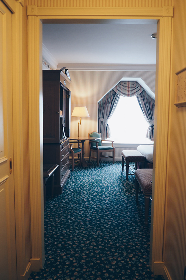 The rooms are very traditional, which is what I expected. Floral carpets and wallpapered walls, surround by a theme of Disney characters. Disney characters on the borders of the wallpaper, on the bed head board, on the mirror frame, even to Peter Pan climbing up the TV cabinet.